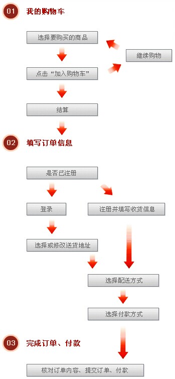 通过导航栏上的商品分类进入商品页面,选择您所需的商品。当您选定了一件商品后,点击“加入购物车”,这时会自动打开购物车页面,商品会添加到您的购物车中。此时,您还可以继续挑选商品,把想要购买的商品都放入购物车中,最后一起结算。在购物车中,每件商品的订购数量默认为一件,如果您想购买多件商品,可修改购买数量。然后点击“去结算”。
